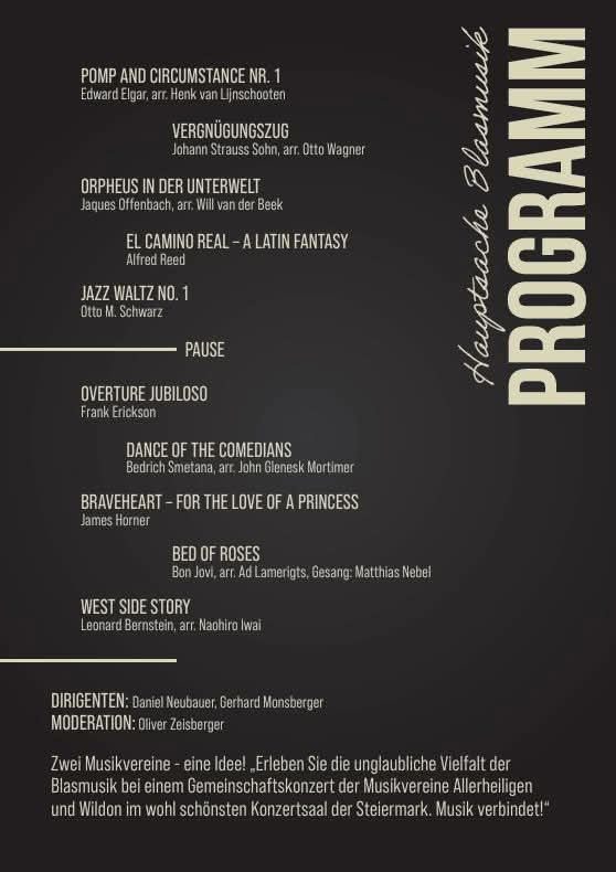 Unser Musikverein Allerheiligen spielt mit dem MV Wildon ein großes Konzert im Stefaniensaal in Graz.